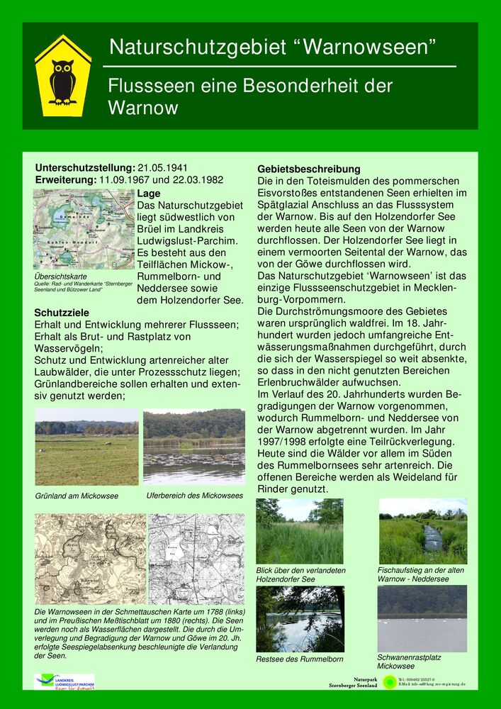 Die Warnow ist mit dem Kanu befahrbar. In Karnin befindet sich eine Naturschutzstation.[1] Das Naturschutzgebiet liegt im Naturpark Sternberger Seenland und im Eigentum der Stiftung Umwelt und Naturschutz M-V.[2] Das Naturschutzgebiet ist nach EU-Recht als Bestandteil des FFH-Gebiets[3] Warnowtal mit kleinen Zuflüssen ausgewiesen.